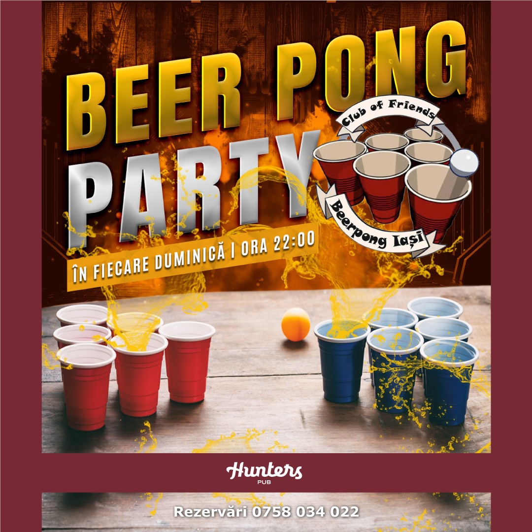 ?Beerpong în Hunters Pub! 1) Echipa va fi formata din 2 participanti 2) Cheta pentru bere este de 35 lei/echipa, 30 până în ora 21.00 3) Premiile constau în: Locul 1: