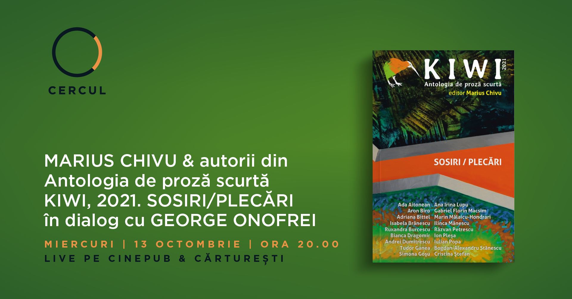 ?Miercuri, 13 octombrie, începând cu ora 20.00, pe paginile de Facebook Cercul și Cărturești va avea loc o nouă ediție „Cercul”, care îi va avea ca invitați pe Marius Chivu & autorii din antologia de proză scurtă Kiwi. Ediția 2021. SOSIRI / PLECĂRI, apărută de curând la Editura Polirom.