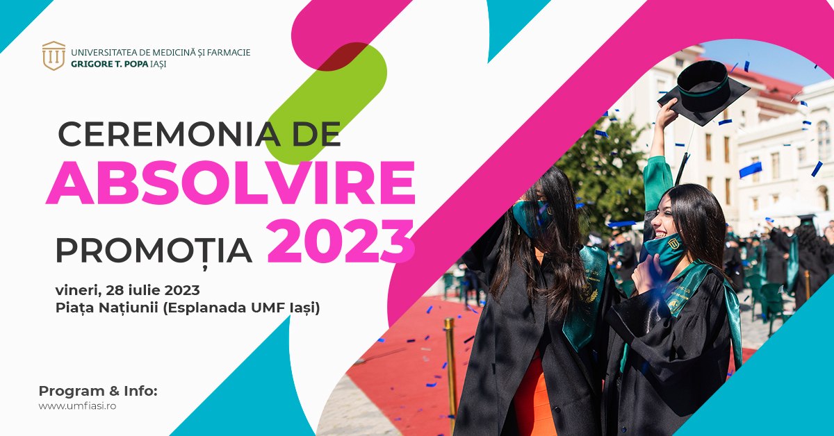 Evenimentul are două părți: cursurile festive ale facultăților, în intervalul 9.00 -17.30, iar de la ora 19.00 este programată Ceremonia de Absolvire în cadrul căreia Rectorul Universității, prof. univ. dr. Viorel Scripcariu, va adresa salutul său Promoției 2023, vor fi premiați șefii de promoție a celor patru facultăți din cadrul UMF Iași, corul Ceata de Mediciniști le va cânta absolvenților și părinților acestora. Urmează speech-uri motivaționale, iar finalul este rezervat, ca de fiecare dată, unui moment solemn așteptat, încă din anul I, de toți studenții UMF Iași: rostirea Jurământul lui Hipocrate.