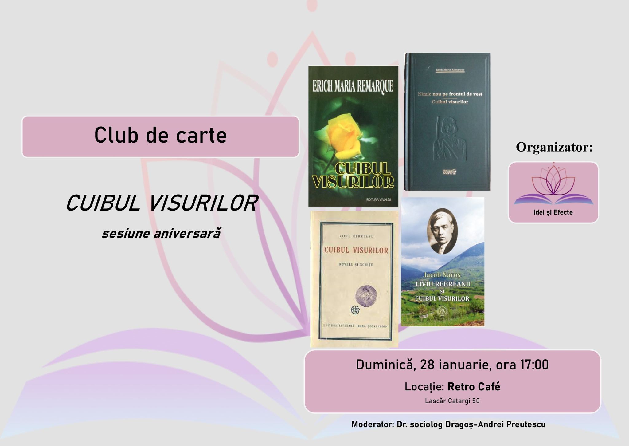 18:30-20:00 – Dezbatere pe baza celor două lucrări scrise de Liviu Rebreanu și Erich Maria Remarque, „Cuibul visurilor”, lucrări ce poartă numele clubului nostru. Dacă timpul vă permite, vă invităm să citiți aceste scrieri și să ne fiți alături la eveniment.