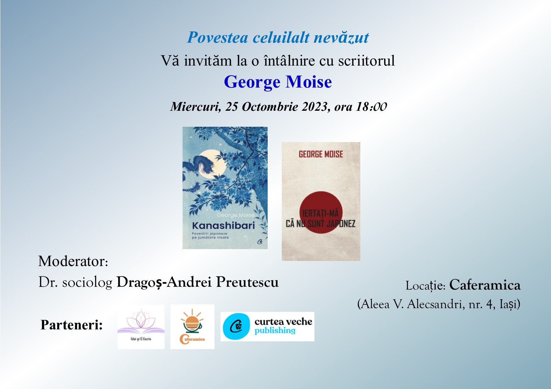 Vă invităm să cunoașteți Japonia prin gândurile, ochii și visurile unui scriitor român. Pe 25 octombrie 2023, de la ora 18:00, la Caferamica, cititorii se pot întâlni cu scriitorul George Moise. „Iertați-mă că nu sunt japonez”, un debut literar care oferă o imagine a adaptării la o cultură diferită de a noastră, a fost primul mesaj venit de la autor către cititorii din România. Recent, a fost lansat volumul „Kanashibari. Povestiri japoneze pe jumătate visate”, ce explorează imaginea străinului în Japonia. De altfel, tema pentru întâlnirea de la Iași a scriitorului George Moise cu cititorii este, „Povestea celuilalt nevăzut”.
