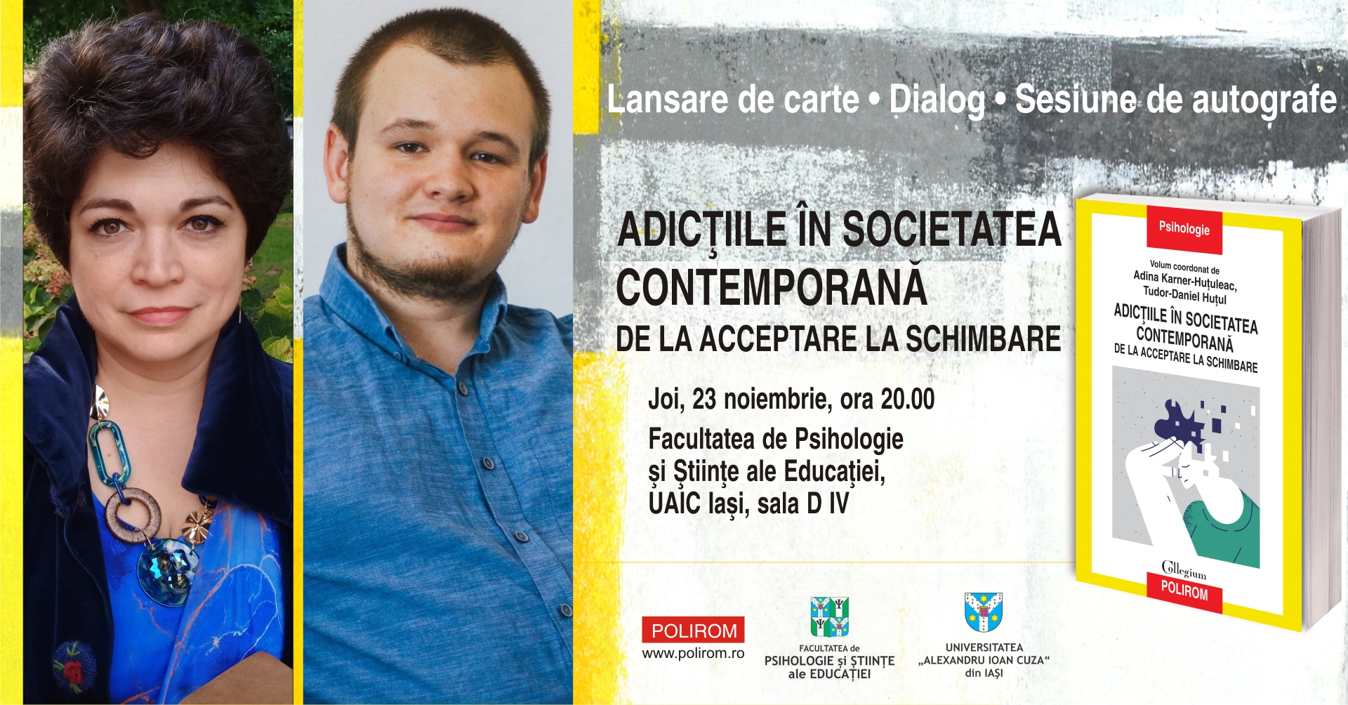 Joi, 23 noiembrie, la ora 20.00, la Facultatea de Psihologie și Științe ale Educației, Universitatea „Alexandru Ioan Cuza” din Iași, sala D IV, va avea loc lansarea volumului Adicţiile în societatea contemporană. De la acceptare la schimbare, coordonat de conf. univ. dr. Adina Karner-Huțuleac și psih. drd. Tudor-Daniel Huțul, apărut de curând în colecția Collegium. Psihologie.
